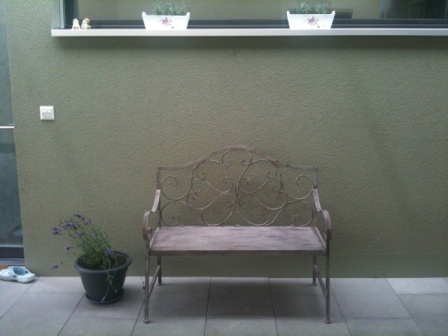 Die Kundin sendete "chüssischlacht" ein Foto einer neu gekauften, antiken Gartenbank aus Eisen vor dem Eingang ihres modernen, gradlinigen Hauses und ein paar Fotos von Servietten mit Mustern, die gefallen würden... (ja - Servietten ;-)